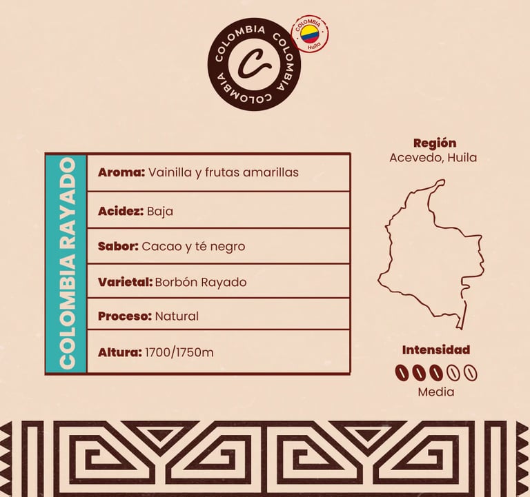 Este exquisito café Colombiano Borbón Rayado nos invita a un viaje sensorial que comienza con una dulzura envolvente y evoluciona hacia un final elegante y persistente. Es un café fermentado anaeróbico con un perfil delicado y aromático lo convierte en una experiencia gratificante en cada sorbo.
